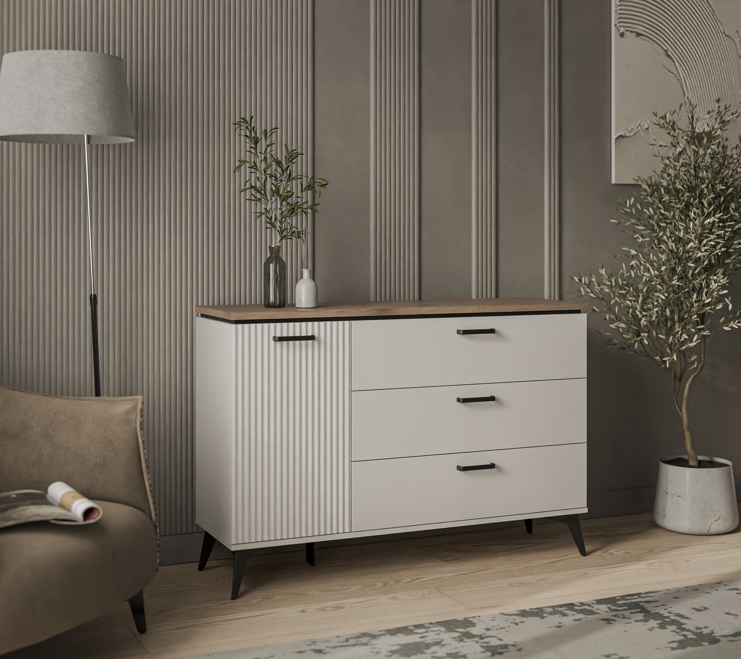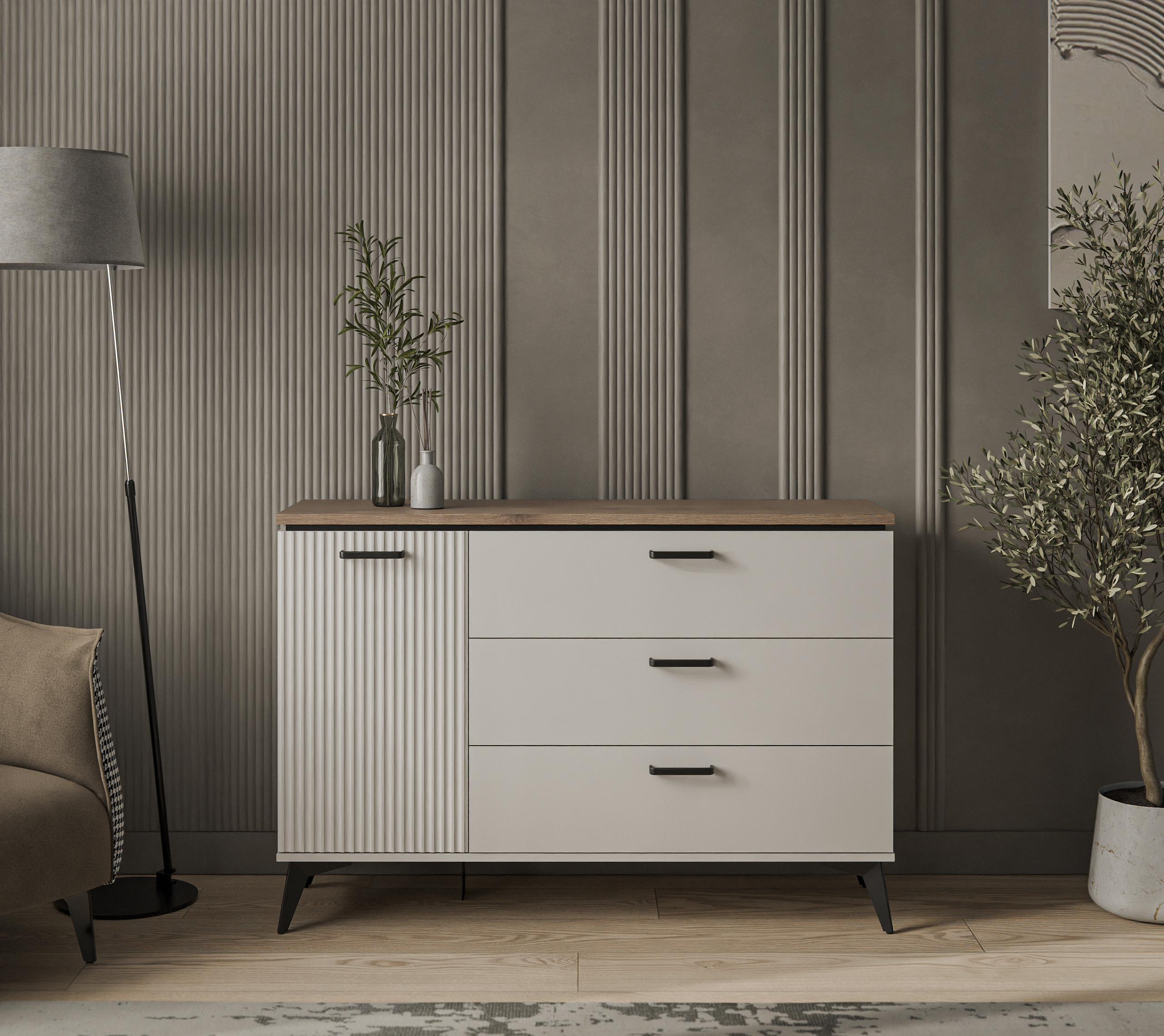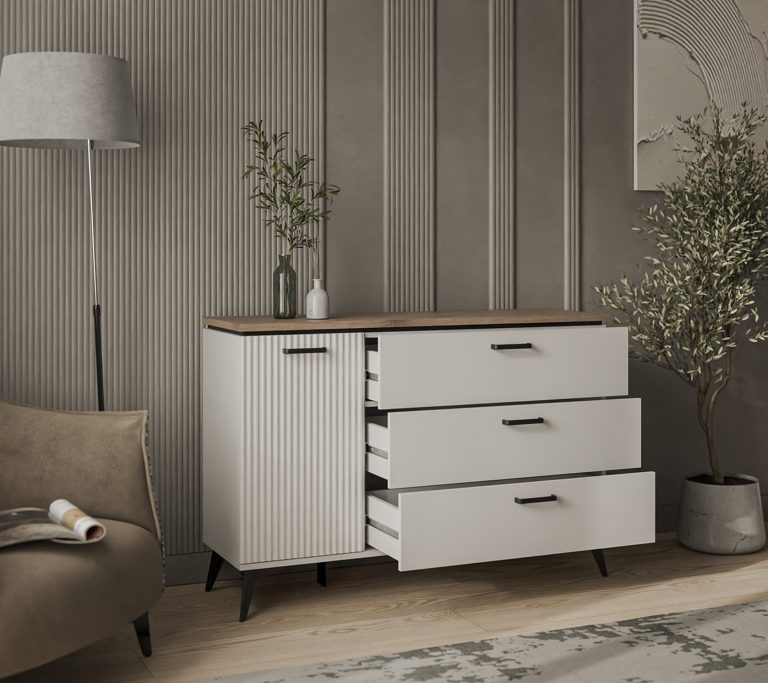 Задняя стенка/дно ящиков: ХДФ (ДВП) - 2,5 мм в паз, цвет – светло-серый.
