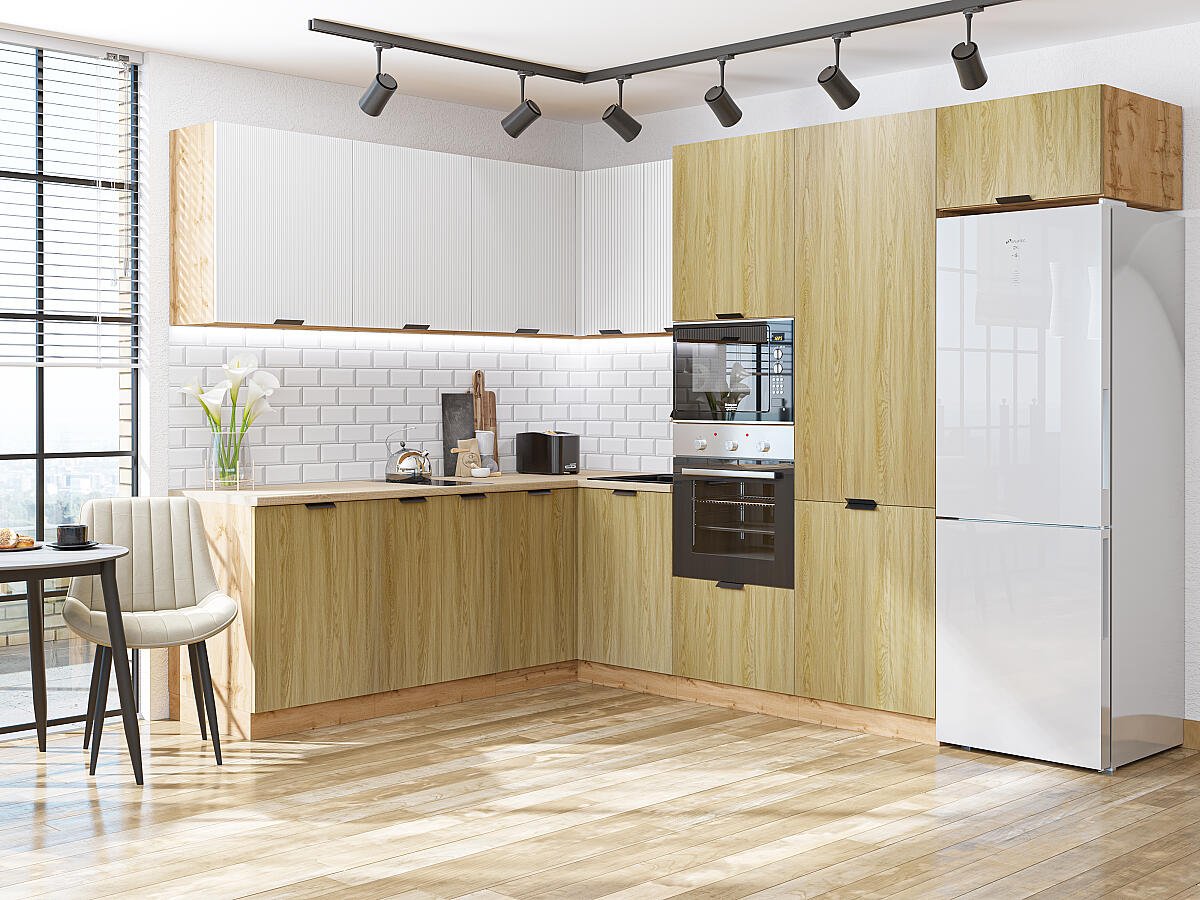 Кухонный гарнитур Евро Лайн-03 215/280х60х214/Белый/Дуб песочный