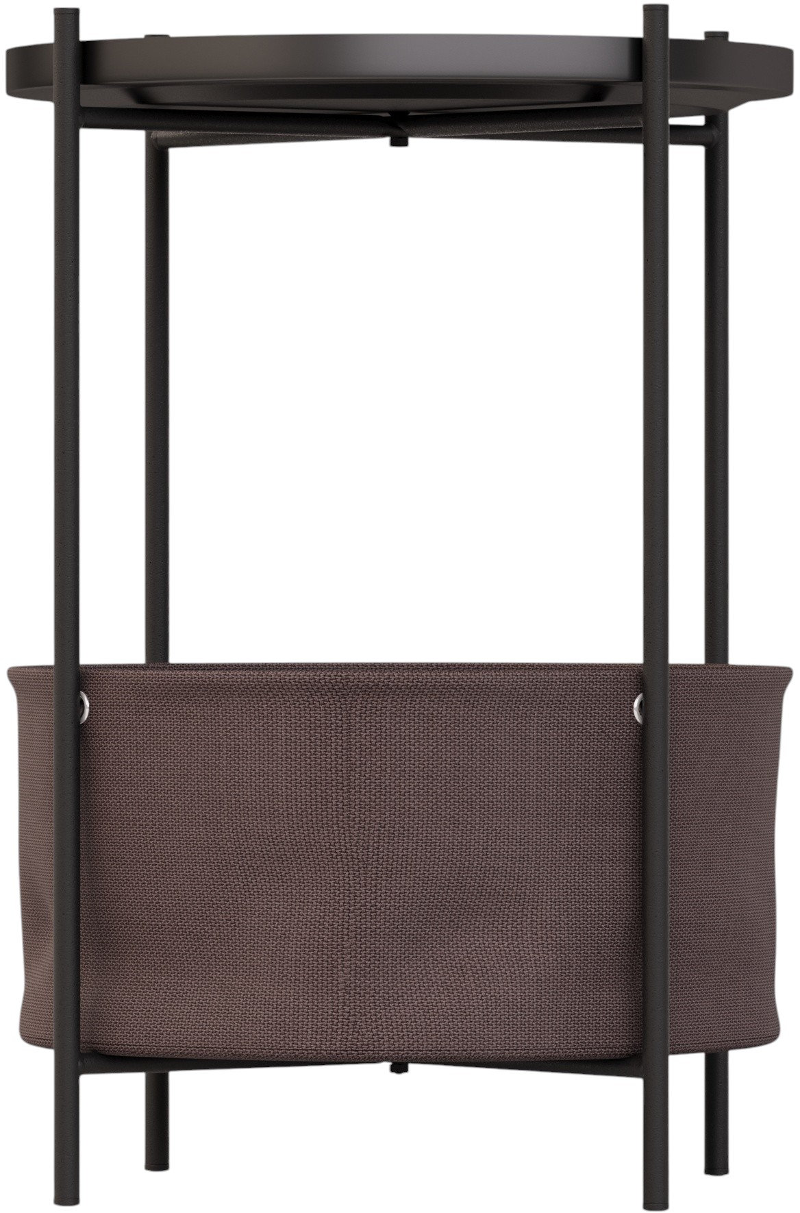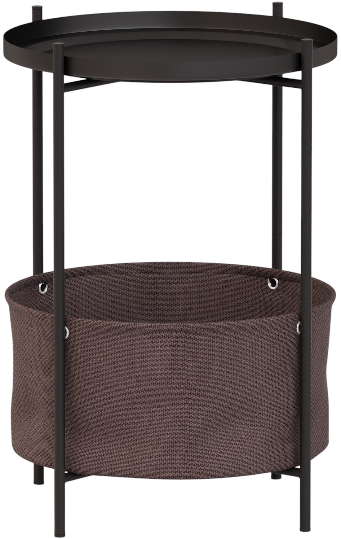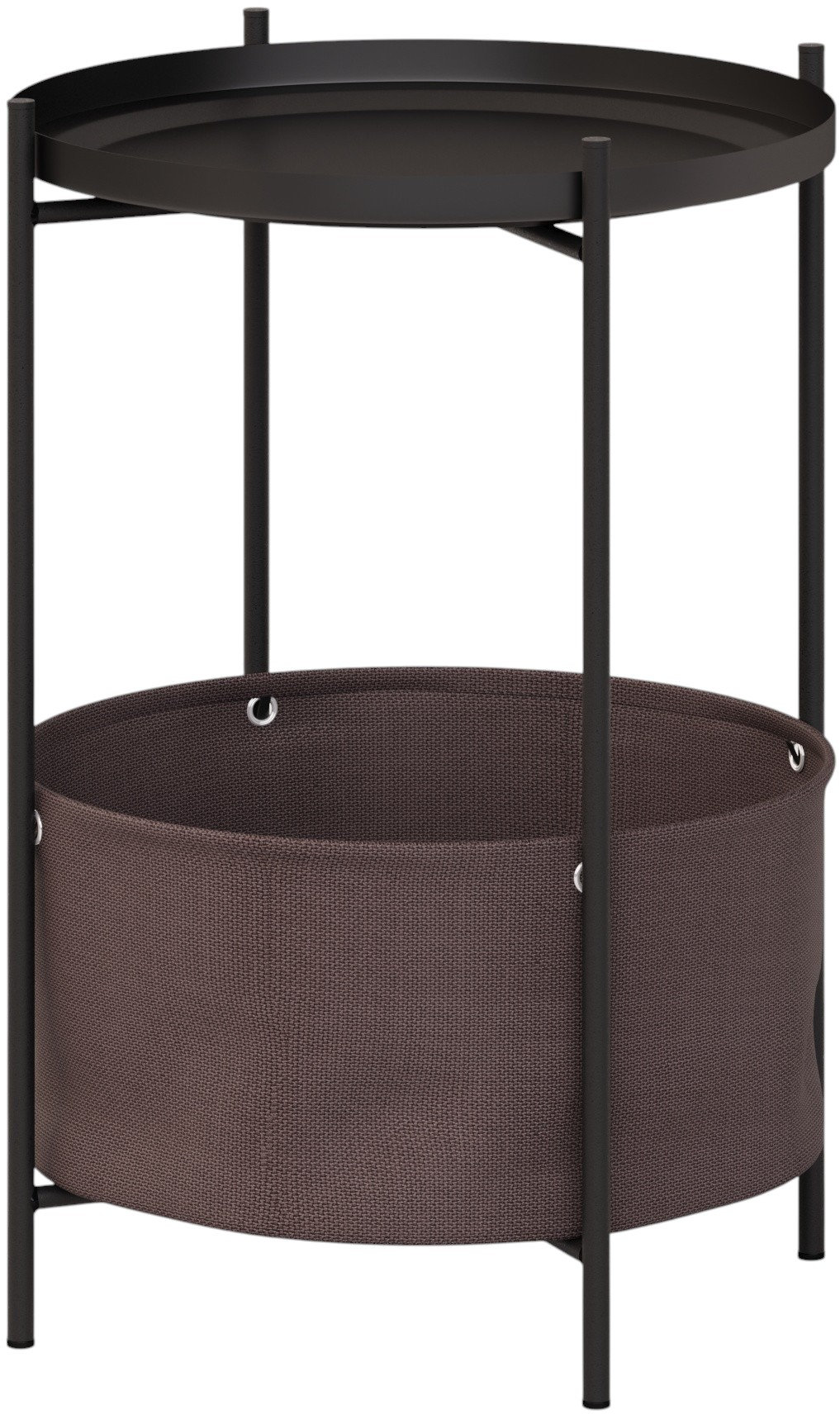 Каркас стола дополнен ёмкостью для хранения мелочей, а металлическая столешница имеет бортик по периметру. Уникальное сочетание металла и ткани придаёт столу универсальности в стилях оформления интерьеров. Главная особенность этой модели в том, что все детали стола съемные и могут использоваться отдельно друг от друга, к примеру, съемная столешница может послужить подносом для еды, а корзину можно использоваться для хранения домашних предметов или детских игрушек.
