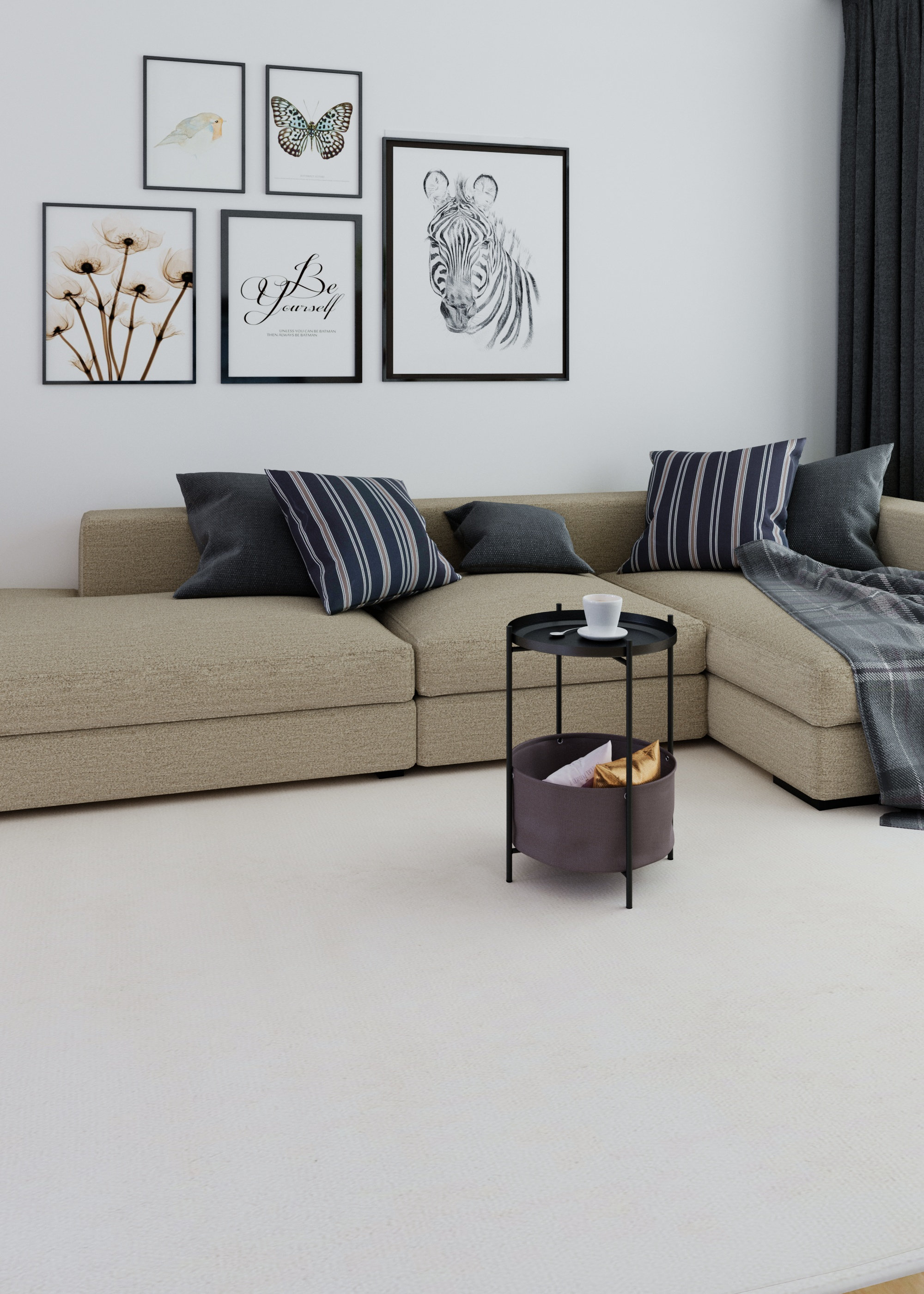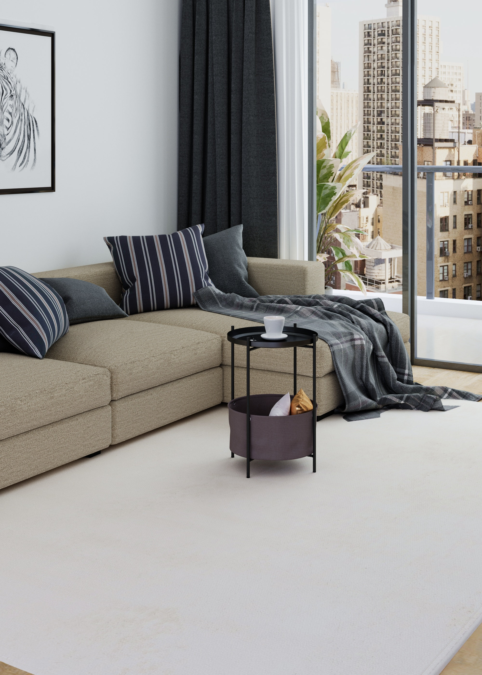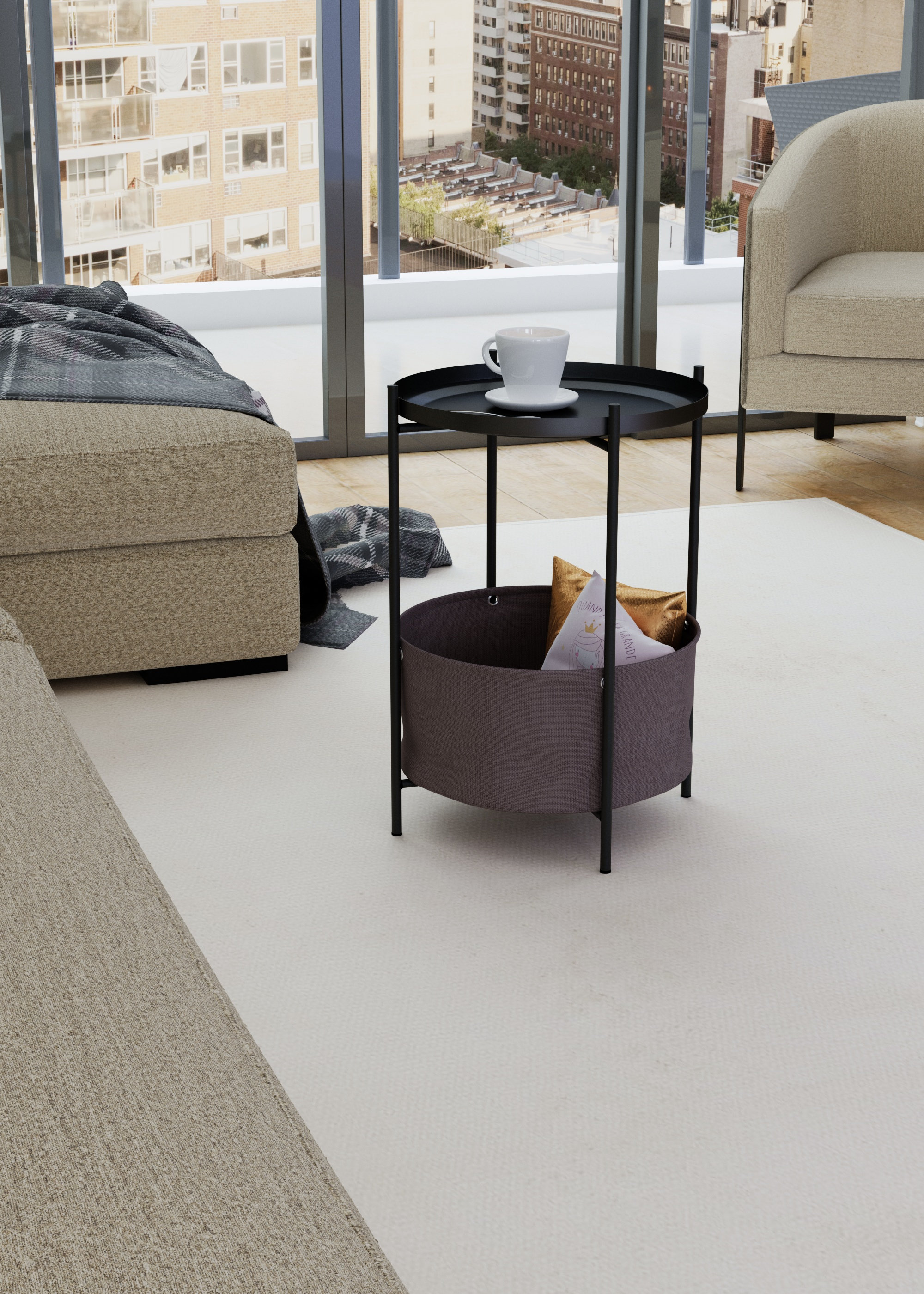 Каркас стола дополнен ёмкостью для хранения мелочей, а металлическая столешница имеет бортик по периметру. Уникальное сочетание металла и ткани придаёт столу универсальности в стилях оформления интерьеров. Главная особенность этой модели в том, что все детали стола съемные и могут использоваться отдельно друг от друга, к примеру, съемная столешница может послужить подносом для еды, а корзину можно использоваться для хранения домашних предметов или детских игрушек.